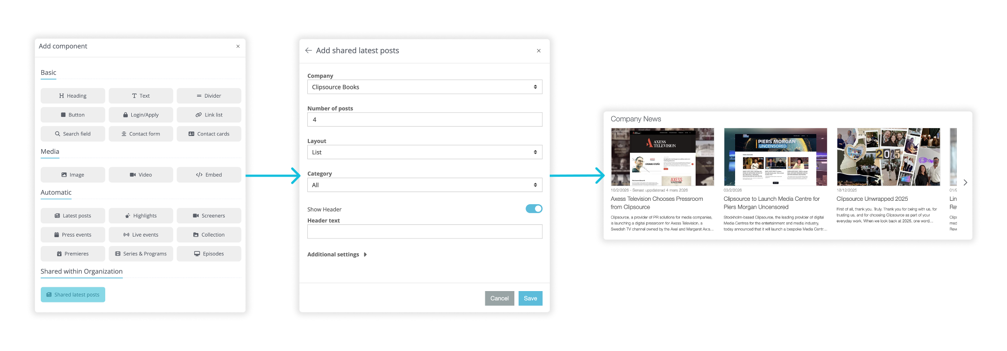 Where to find it: Media Center → Pages → Edit page or create a new one → Add component (Shared within Organization) → Shared Latest Post