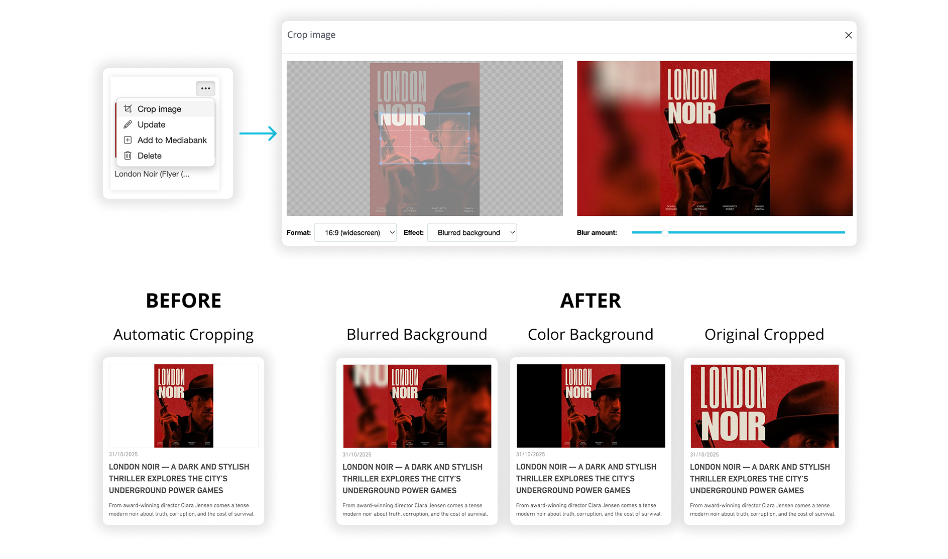 In the previous version, cropping behavior varied between modules — in Mediabank, cropped images were stored as separate versions, while other areas replaced the existing crop directly. This often caused confusion and extra file handling.